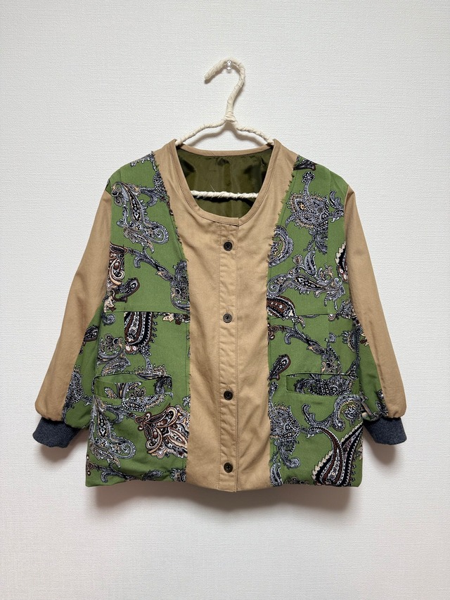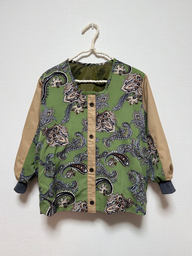 「まとう、ペイズリー×シーム・ポケット」 大人服として愛されたチノシャツと、 クラシカルなペイズリー柄ワンピースをほどき、 小さなからだにもう一度仕立てました。 ノーカラーで顔まわりはすっきり。 袖口にはリブを付けて、動きやすさと温かさをプラス。 切りっぱなしの切り替えを施したバックスタイルは、総裏仕立てでスマートながらもカジュアルな印象を与えます。 秋〜春先まで長くご着用ください。 手放せなかった大人の一着が、新しい季節に似合う小さな服に生まれ変わりました。 ⸻ ■素材 表地:綿、ポリエステル 裏地:ポリエステル(ストック裏地使用) 袖リブ:コットンニット ■サイズ 4y~6y、110cm相当(モデルさんはたっぷりオーバーサイズでご着用いただいています) モデル身長:左100cm/右90cm 身幅:41.5cm 着丈:46cm 袖丈:37cm(リブ含む) ※平置き採寸。多少の誤差はご了承ください。 ■ お手入れ/取り扱い注意事項 ・お洗濯は冷水で手洗いをお勧めします。 ・乾燥機は使用しないでください。自然乾燥を推奨します。 ■ 発送・注文に関する情報や注意事項 ・通常、注文後5営業日以内に発送いたします。 ■ その他の情報や注意事項 ・商品写真はできる限り実物の色に近づけるよう徹底しておりますが、 お使いのモニター設定、お部屋の照明等により実際の商品と色味が異なる場合がございます。予めご了承ください。 ・着用状況により、異なるサイズ感を感じる場合がありますので、各所のサイズをご参照ください。 ・商品の詳細や不明点については、お気軽にお問い合わせください。 【古着・ヴィンテージファブリックを使用した商品につきまして】 使用している素材は、どなたかが大切に大切に着ていた服です。 そのため、特有のダメージや匂い、着用癖による布地の変形などがあったり汚れやシミがある事がございます。 リペアできるものは行ってから製作に入っておりますが、すべてではないことをご理解の上ご購入をお願いいたします。 また、素材はできるかぎり丁寧に判断していますが、タグなどがない場合は推測での表記となる場合がございます。 誠に恐れ入りますが、お客様ご都合による返品交換は一切承っておりません。 予めご了承ください。 ★このお洋服が生まれ変わるまでのBefore and afterは、Instagramにてご紹介しています。 よろしければそちらもご覧ください。 → @soie_childrenswear