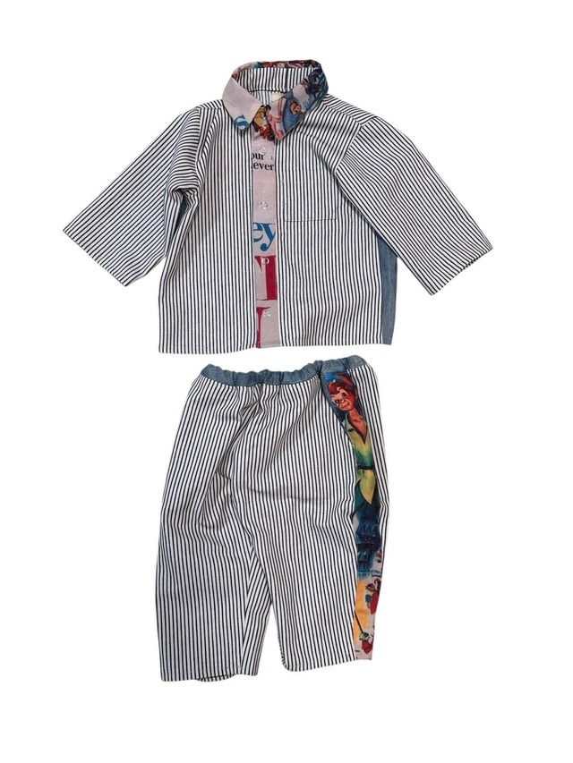 敢えて隠して配したピーターパン。 思い出のタグは、SOIEのタグにひっそりと残しました。 古着のリーバイスデニムとヴィンテージファブリック、ヒッコリーデニムからお仕立てしたカバーオールとパンツ。 ヴィンテージファブリックは元々バッグだったものを解体して使用しました。 同じは無い、唯一無二の絵柄。 袖は七分丈に、スナップボタン仕様で着脱も簡単です。 一年中着られる、世界でたったひとつのセットアップ。 <素材> コットン <サイズ(100cm)> ・カバーオール 着丈38cm 肩幅28.5cm 身幅34.5cm 袖丈26.5cm ・パンツ ウエスト48cm 股上24cm 股下25.5cm ■ お手入れ/取り扱い注意事項 ・お洗濯は冷水で手洗いをお勧めします。 ・乾燥機は使用しないでください。自然乾燥を推奨します。 ■ 発送・注文に関する情報や注意事項 ・通常、注文後5営業日以内に発送いたします。 ■ その他の情報や注意事項 ・商品写真はできる限り実物の色に近づけるよう徹底しておりますが、 お使いのモニター設定、お部屋の照明等により実際の商品と色味が異なる場合がございます。予めご了承ください。 ・着用状況により、異なるサイズ感を感じる場合がありますので、各所のサイズをご参照ください。 ・商品の詳細や不明点については、お気軽にお問い合わせください。 【古着・ヴィンテージファブリックを使用した商品につきまして】 使用している素材は、どなたかが大切に大切に着ていた服です。 そのため、特有のダメージや匂い、着用癖による布地の変形などがあったり汚れやシミがある事がございます。 リペアできるものは行ってから製作に入っておりますが、すべてではないことをご理解の上ご購入をお願いいたします。 また、素材はできるかぎり丁寧に判断していますが、タグなどがない場合は推測での表記となる場合がございます。 誠に恐れ入りますが、お客様ご都合による返品交換は一切承っておりません。 予めご了承ください。 ★このお洋服が生まれ変わるまでのBefore and afterは、Instagramにてご紹介しています。 よろしければそちらもご覧ください。 → @soie_childrenswear